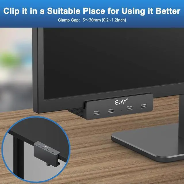 • Innovation Design-No More Sliding: Adajustable Clamp Hub,Replace traditional USB Hub which with the disadvantages of sliding everywhere,hard to plug and unplug and take up space,the new design Hub can fit the thickness from 0.2 to 1.2 inches (5-30mm)extended the USB fuction from host to desk, install the hub where you need at a convenient place,enjoy the stable data transmission more easier and no need to squat down the table to connect every device