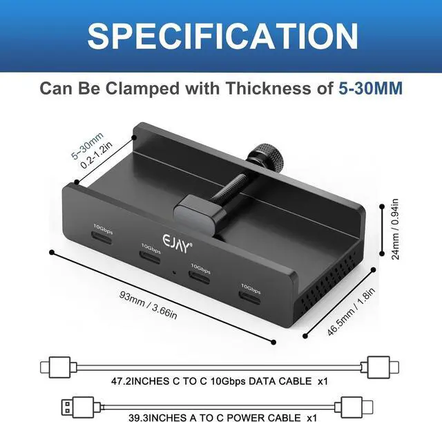 10Gbps USB C Hub - EJAY 4Ports Aluminum USB 3.2 Docking Hub Clamp Design for Desk/Computor with Extra Power Supply Port and 47inches Long Data Cable&39inches Power Cable(Black)
