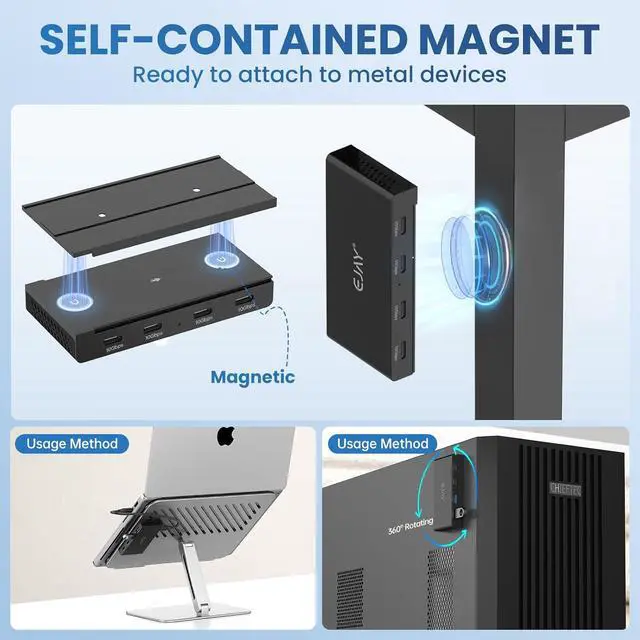 Magnetic 4-Port USB-C Hub: Expand a single USB-C port into four. The built-in magnets securely attach the hub to any metal surface, preventing slips or shifts during use