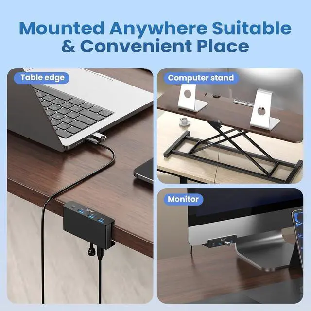 Innovation Design-No More Sliding: Adajustable Clamp Hub,Replace traditional USB Hub which with the disadvantages of sliding everywhere,hard to plug and unplug and take up space,the new design Hub can fit the thickness from 0.2 to 1.2 inches (5-30mm)extended the USB fuction from host to desk, install the hub where you need at a convenient place,enjoy the stable data transmission more easier and no need to squat down the table to connect every device