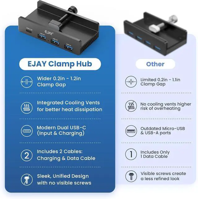• Innovation Design-No More Sliding: Adajustable Clamp Hub,Replace traditional USB Hub which with the disadvantages of sliding everywhere,hard to plug and unplug and take up space,the new design Hub can fit the thickness from 0.2 to 1.2 inches (5-30mm)extended the USB fuction from host to desk, install the hub where you need at a convenient place,enjoy the stable data transmission more easier and no need to squat down the table to connect every device