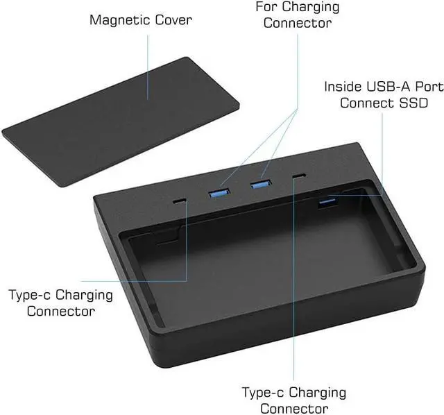 5 IN 1 Ports USB HubThe Tesla Model 3 accessories have 5 Ports, 2 front USB-A and 1 USB-A connector inside the secret compartment for game controllers, wireless chargers, music, etc, 1 Type-C connector and 1 USB-C for Tesla OEM Charging Pad.