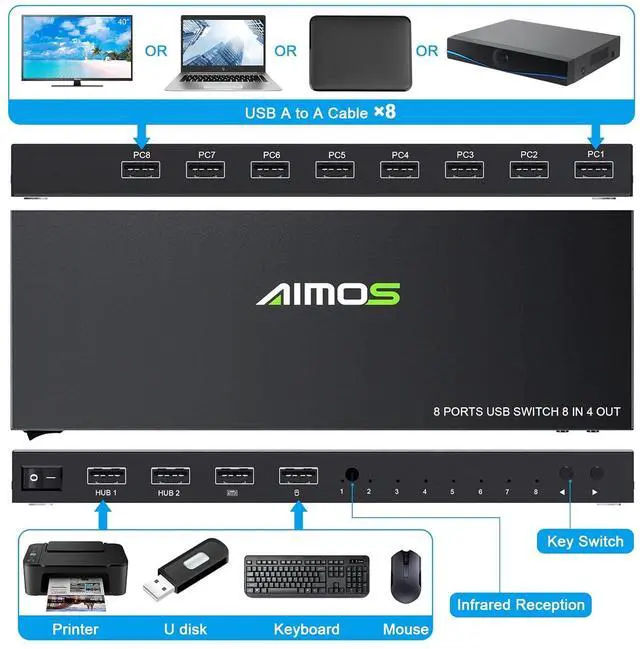 This USB switch 8 ports device allows up to 8 users to share 4 USB 2.0 peripheral devices, No need to constantly swap cables or set up complicated network sharing software.