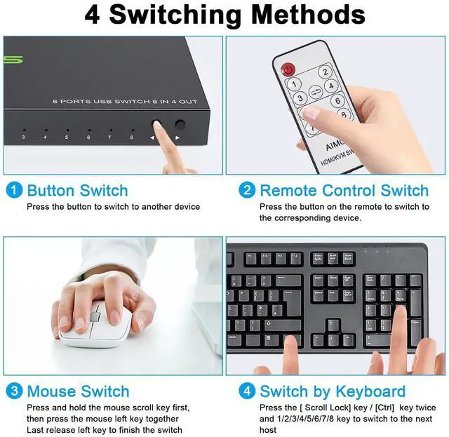 Four switching modes: 1. Host button, 2. Remote control, 3. Mouse, 4. Support hotkey function, use the hotkey on the keyboard to switchScroll Lock, Scroll Lock, 1/2/3/4/5/6/7/8) and (Ctrl, Ctrl, 1/2/3/4/5/6/7/8).