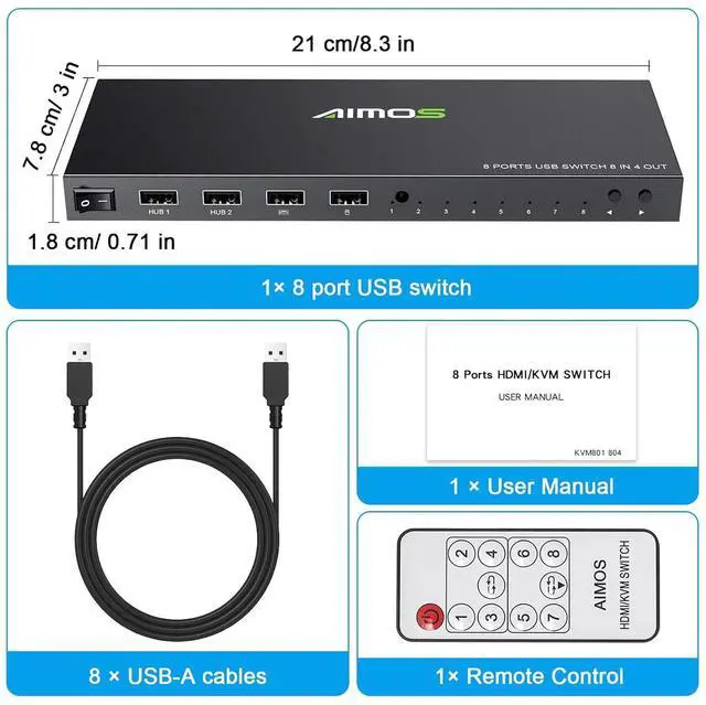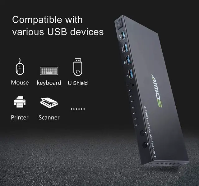 8 in 4 out USB KM switch box support speed up to 4800Mbps; backward compatible with USB 2.0/1.1 device. Plug and play, support Windows XP/7/8/10/Vista, MAC OS 8.6 and above.