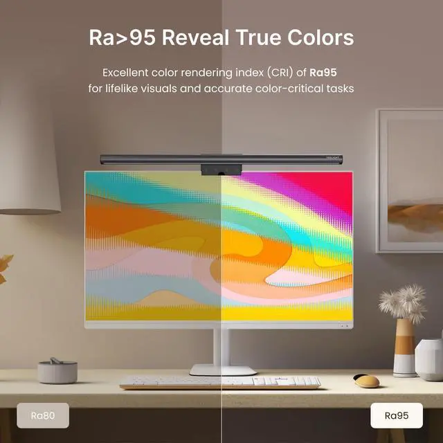 Ultra-High CRI Ra95 for True Color FidelityIlluminate your workspace with stunning color accuracy and ultimate eye care. YEELIGHT's ScreenBar features an ultra-high Color Rendering Index of Ra95, paired with 78 high-quality LED beads, providing even, ample illumination. It minimizes shadows and glare, creating a comfortable, natural lighting environment ideal for reading, working, and gaming. The screen lamp ensures vibrant, true-to-life colors, perfect for color-related professionals. Maintain screen color calibration and reduce eye fatigue with this monitor light bar, enhancing productivity and comfort