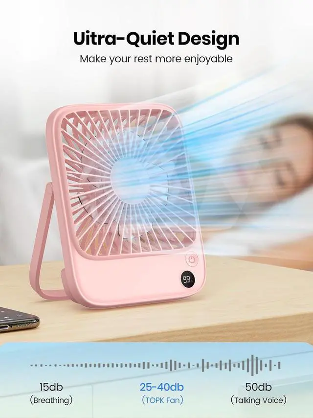 Upgrade 5000mAh Battery Stay cool all day long with up to 6-16 hours of continuous operation from a single full charge. The integrated 5000mAh rechargeable battery keeps you refreshed, whether you're indoors or out on travel, and foldable fan bracket making TOPK thin desk fan more easy to carry