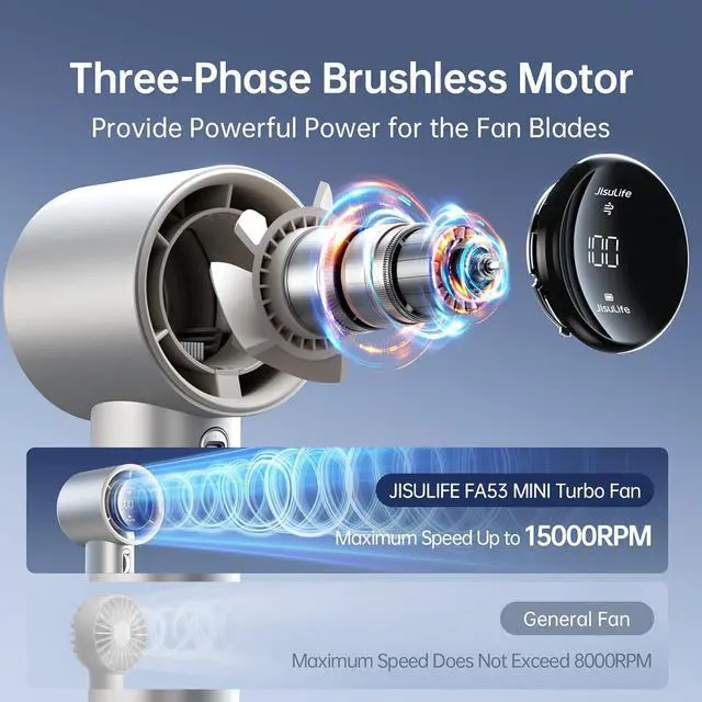 Brushless Motor - Super Power: The combination of a three-phase brushless motor and a 5000mAh battery significantly improves the wind speed, power, and endurance. The maximum wind speed can reach 9m/s. The highest rotation speed of the handheld fan is three times that of a regular personal fan, reaching up to 15000 RPM. It can cool for 3-15 hours on a single charge