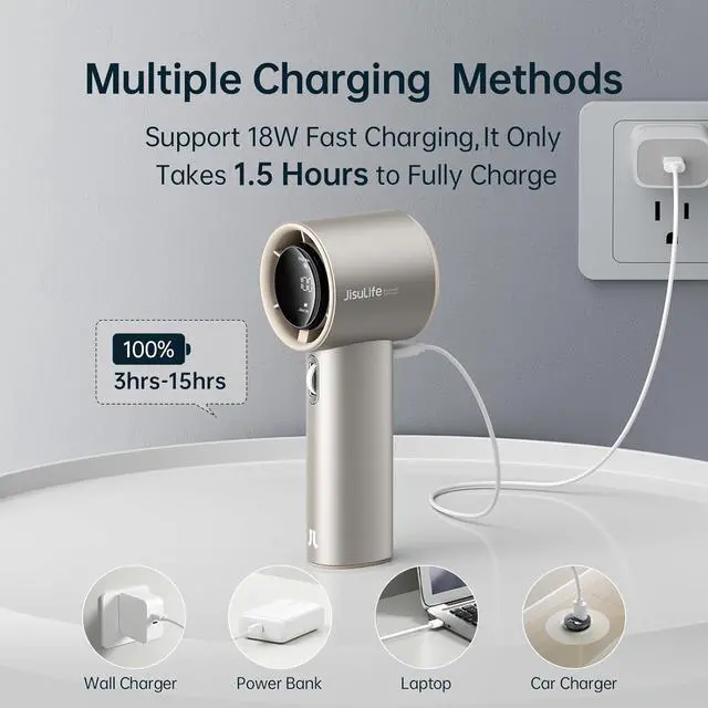 Multiple Charging Methods - Fast Charging: This USB rechargeable fan supports an 18W fast charging plug, which can be fully charged in just 1.5-2 hours and provides up to 15 hours of cooling time when fully charged. In addition to the included USB Type-C (3.28ft) cable, this battery operated fan also comes with an extra USB Type-A (16.40ft) cable, allowing you to charge it with a regular USB socket, laptop, power bank, or car charger