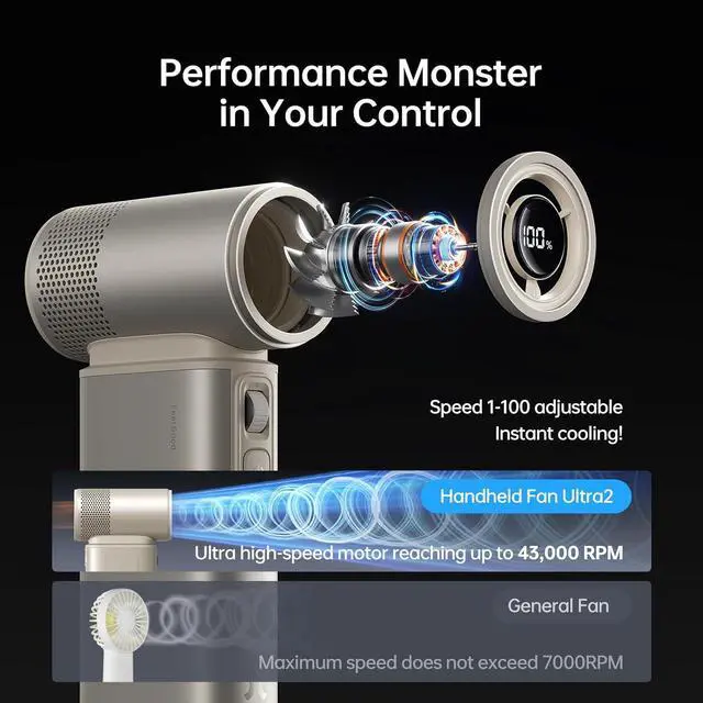 100 Speed Hurricane: Portable fan has powerful 1-100 adjustable wind speeds, 43000 RPM ultra motor, max wind distance can reach 17 m/s. Press and hold for 3s into 100 speed, activate Storm Mode! Release to restore the original speed. Easy to operate, adjusted by a scroll wheel, this personal fan can be customized for cooling tailored to your needs