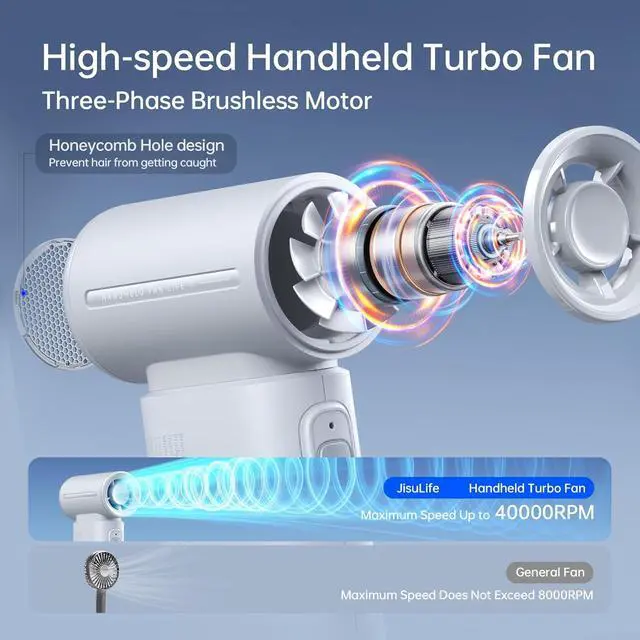 Powerful Wind, Fast Cooling: JISULIFE powerful portable turbo fan adopts advanced 9-blade design, with high-speed three-phase brushless motor, providing a maximum wind speed of up to 10m/s. 40000 RPM, which is four times that of ordinary handheld fans, brings you a strong and stable wind experience