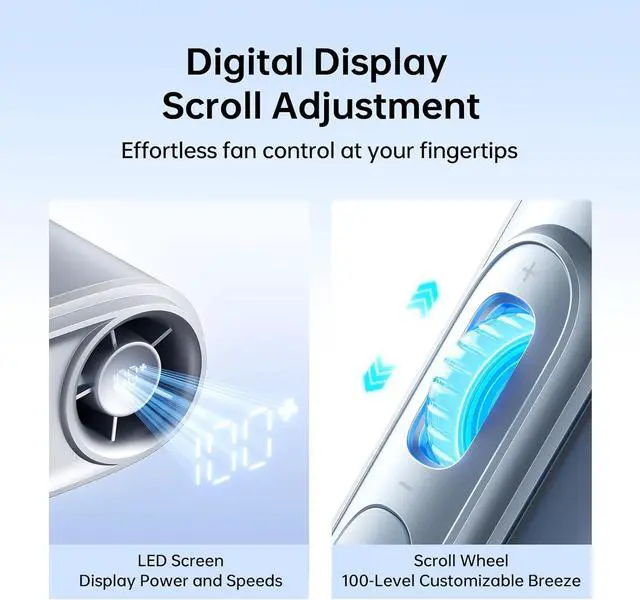 Smart LED - Instant Adjustment: Personal fan boasts smart LED displays, real-time speed (1-100) and battery %. Short press to power on/off; double-tap for battery check. Rotate the roller up and down to adjust the air volume instantlyno fumbling! Auto-switches to speed display after 5s, between modes for gym, commute, or travel ease