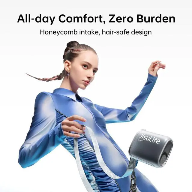 100-Speed Turbo Power with High-Efficiency Motor: Neck fan with 9-blade turbo fan and brushless motor blasts 7.8m/s winds (10cm distance) at 40,000 RPM max100 adjustable speeds from breezy to hurricane-grade cooling! 6.3W high performance ensures rapid cooling, roller adjusts wind speed, balances strong power and portability, and provides an efficient heat dissipation experience integrated with wearable design