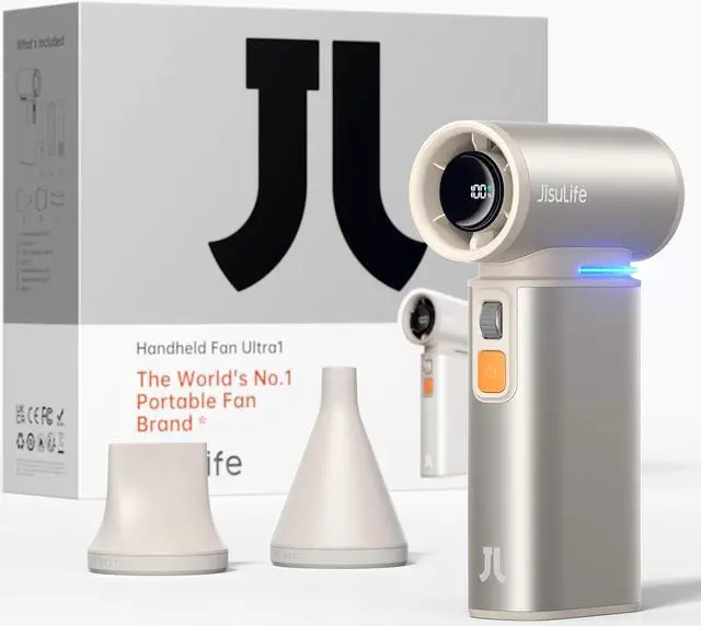 75000RPM High Speed Motor - Strong Wind Fan: JISULIFE handheld fan, as battery operated fan, witch adopts 9000mAh rechargeable battery to improve the wind speed. The maximum wind speed can reach 19m/s. The highest rotation speed (1-100) of 100% reach up to 75000RPM, as high as the wind speed of a hair dryer. The moderate speed is designed for personal fan use, and the highest speed is working as a electronic air blower