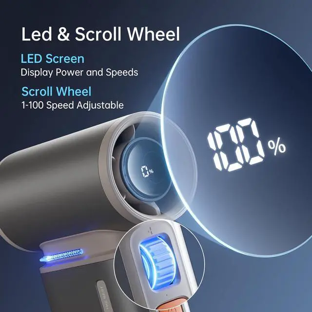 Scroll Wheel - 1-100 Wind: The LED display can check the speed and remaining in real time. The fan with 1-100 Speed to blow cold air, and you can roll the scroll wheel to adjust a comfortable speed. After charged, 15% wind works for 6 hours in 6m/s, 70% wind works for 3hours in 11.3m/s, 100% wind works for 1hours in 19.2m/s. If the battery suddenly drops from 100% to 70%, please restart and try again