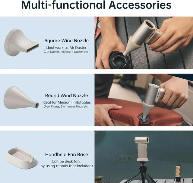 Equipped with Two Nozzle: The hand fan equipped with square nozzle and round Nozzle. The speed of 100% is designed for dust elimination and air Inflation. The Hand Fan can work as air duster to inflate swimming rings, small bouncy beds, balloon, and more