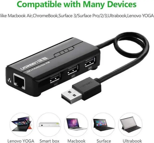 Ugreen 20264 USB 2.0 Hub 3 Ports with 10/100Mbps Ethernet Network could not only add a network interface to your computer via USB but also to connect your computer to multiple devices, such as digital cameras, PC fans, flash driver. It is an ideal solution for notebook, tablets that do not come with ethernet port.