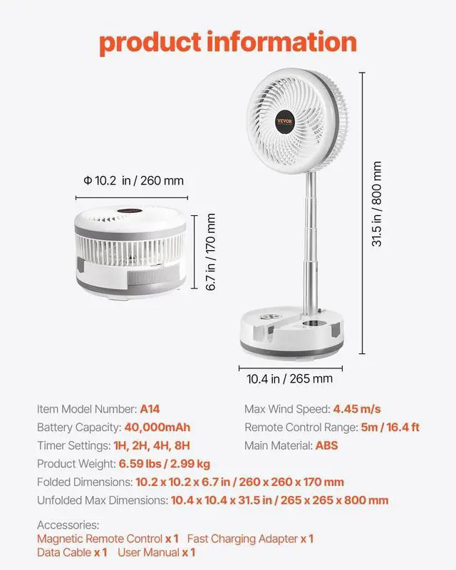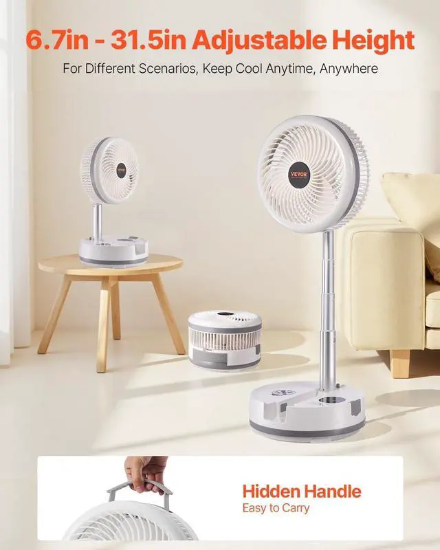 Adjustable Height: This desk fan features flexible height adjustment ranging from 6.7 inches to 31.5 inches, easily adapting to various scenarios. Whether on a desk, bedside, or during outdoor activities, it provides the ideal cooling experience. The hidden handle design makes the fan easy to carry