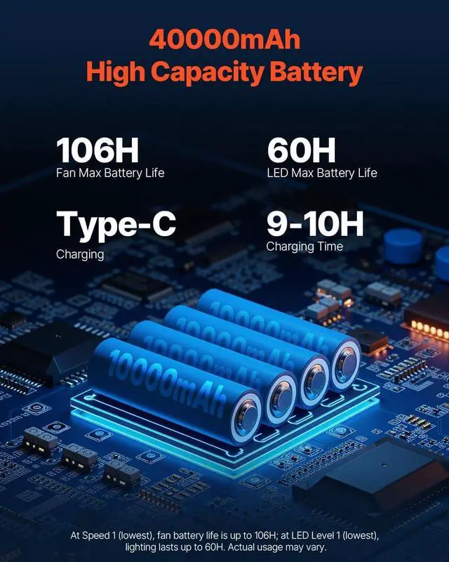 Long-Lasting Battery: Powered by a 40,000mAh large-capacity battery, the small fan can run for up to 106 hours on speed 1 when fully charged. The LED light on speed 1 lasts up to 60 hours. The convenient Type-C charging port ensures fast and efficient charging, providing strong compatibility whether you're at home or outdoors