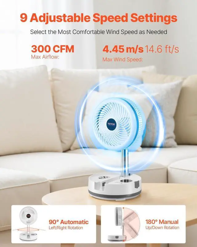 9-Speed and Auto Rotation: Equipped with 9 adjustable speed settings, the quiet fan delivers a maximum wind speed of 4.45m/s and airflow up to 300 CFM. It features 90-degree automatic left-right rotation and 180-degree manual up-down rotation, allowing you to easily select the most comfortable airflow experience according to your needs