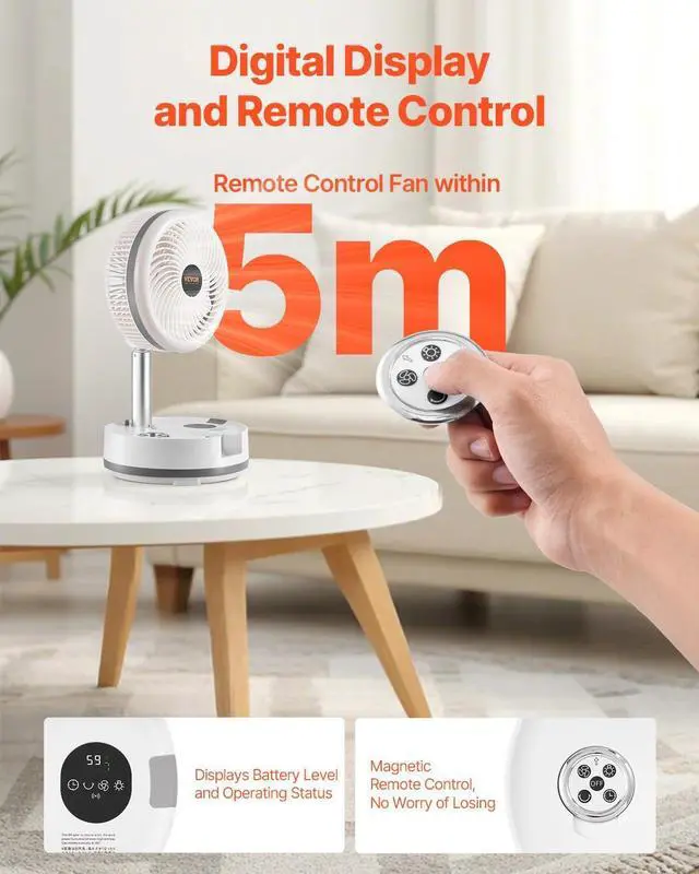 Easy Operation and Setup: Equipped with a digital display that clearly shows battery level and operational status, the magnetic remote control makes operation more convenient. You can easily control the fans on/off and speed settings within 5 meters, ensuring comfort from any position. The unique magnetic design allows the remote to be attached to the fan, avoiding loss