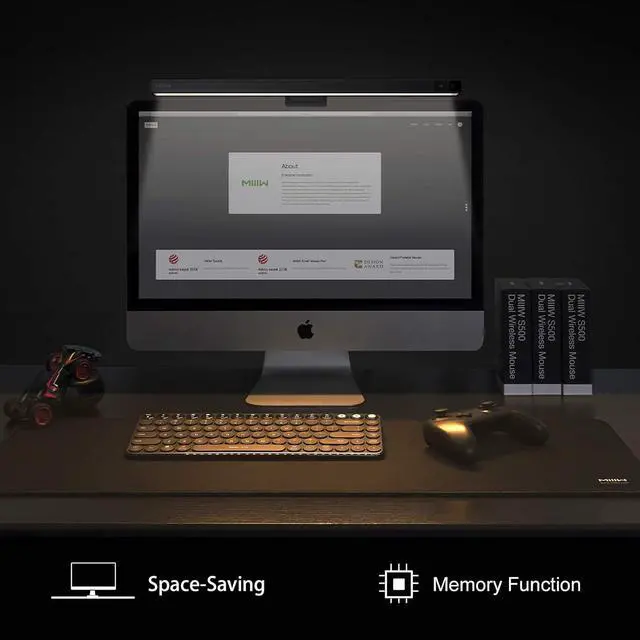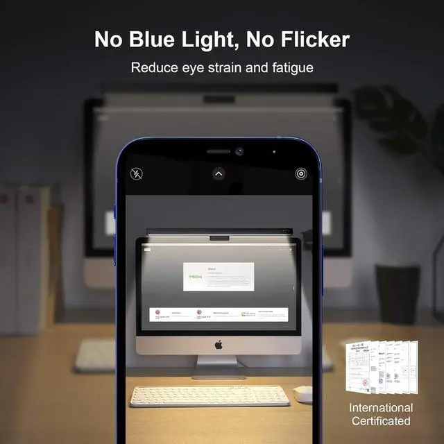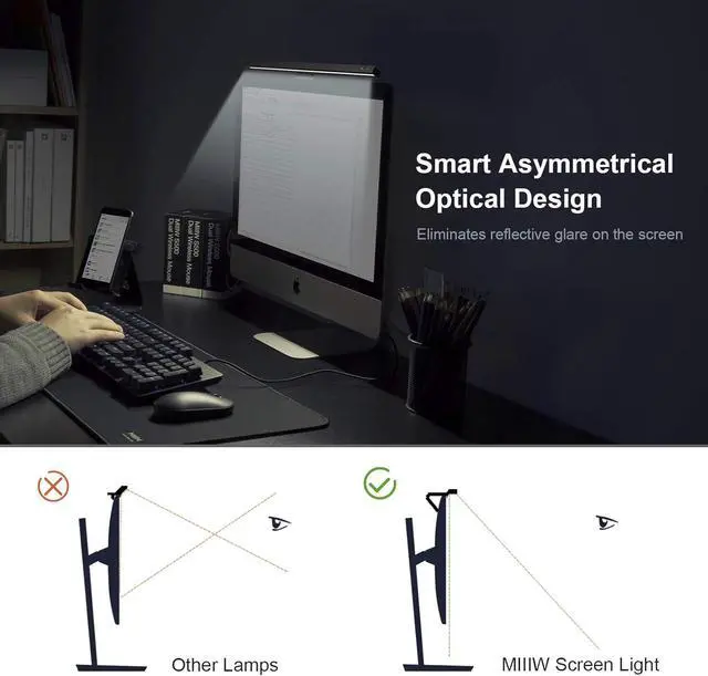 Intelligent Light for Eye Care Benefiting from asymmetrical optical design, the screen lamp lights up your desktop only, effectively eliminating reflective glare on the screen to protect your eyes.