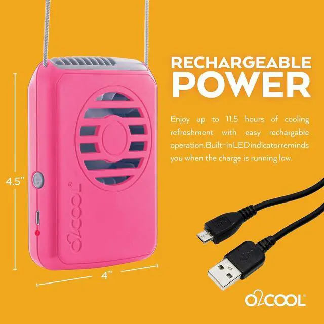 • NECKLACE FAN - NOW RECHARGEABLE! The best-selling hanging neck fan from O2COOL is now fully rechargeable, no batteries required! Easily charge it with the included micro USB charging cable. Light flashes while charging. Once charge is complete, light stops flashing.