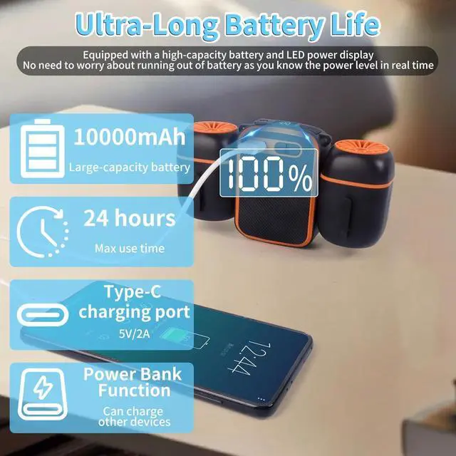 3 Adjustable speed: This outdoor neck fan features three wind speeds, ranging from gentle breezes to powerful gusts, allowing you to customize your cooling experience. Under high voltage, it can operate for 7 hours, while under low voltage, it can last for 24 hours. It has a memory function. The portable fan will remember your preferred speed setting. Whether you are working in hot conditions or enjoying outdoor activities, this fan can provide the perfect balance of comfort and long-lasting performance