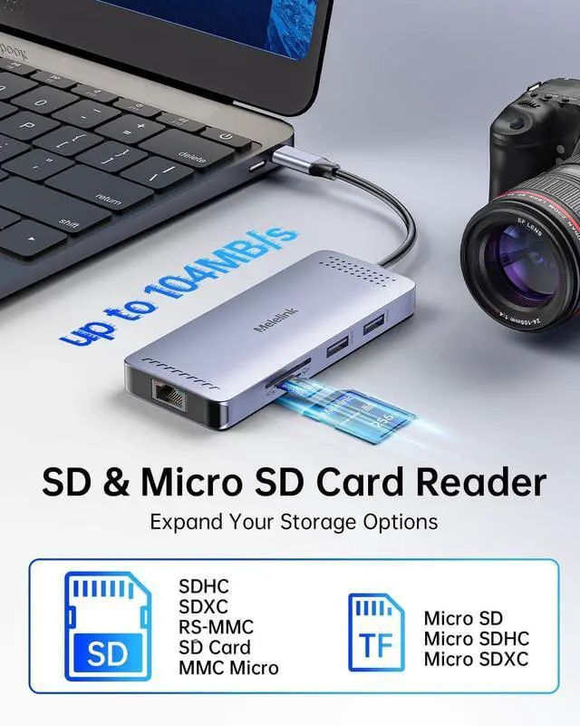Fast Data Transfer SpeedsThis USB-C docking station includes 2 USB-A 2.0 ports, 1 USB-C port, and 1 USB 3.0 data port, allowing you to connect hard drives, printers, mice, keyboards, and other USB devices to your laptop. USB C to Gigabit Ethernet adapter supports data transfer speeds of up to 480 Mbps, letting you transfer and back up your files in seconds. It also features built-in SD and microSD card slots for easy access to files from universal SD and microSD memory cards.
