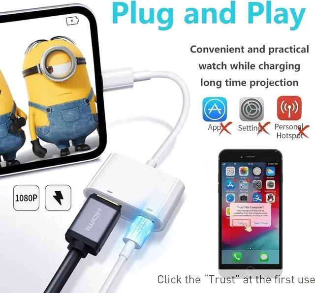 • Full 1080P HD DisplayEnjoy superior screen mirroring with our HDMI adapter for iPhone and iPad. This cable allows you to mirror your iPhone or iPad content on an HDMI-enabled TV, monitor, projector, or other compatible display, providing up to 1080p resolution. This is a perfect accessory for home entertainment, business presentations, education, and training.