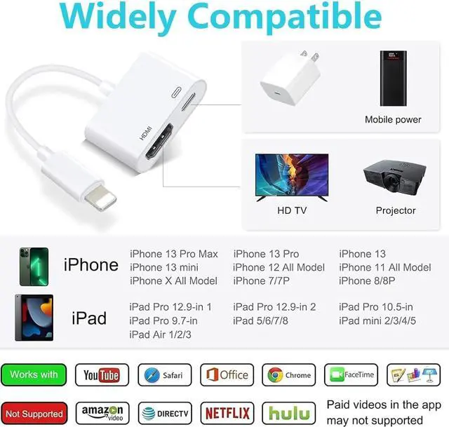 • Supported AppsNote: [Not Supported Apps: apps with the "HDCP" protocol, including Netflix, Video, Hulu, Prime Video, Sky Go, iTunes, Comcast tv, Xfinity, HBO go, DIRECTV, and other paid TV watching apps]. Our HDMI to iPhone adapter supports various apps like YouTube, Hulu Plus, IDMB, Family On TV, ABC, NBC, FOX, and local videos.