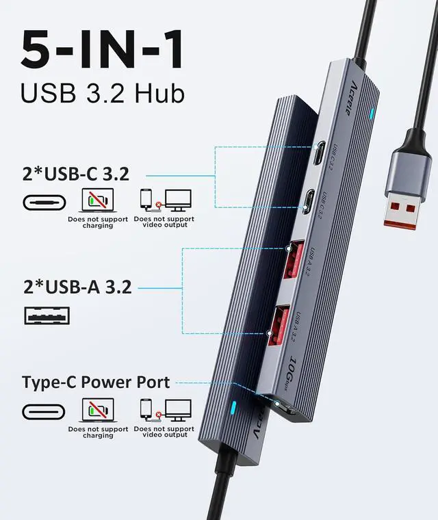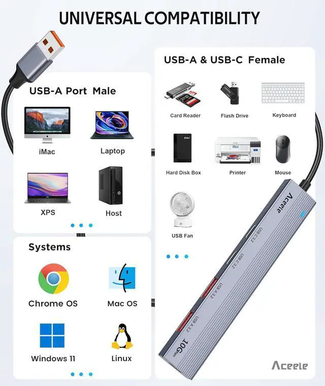 Widely Compatibility Aceele USB 3.2 Gen 2 Hub is compatible with Windows, Mac OS, and Android systems. Plug and play, no driver required. Small and light, easy to carry.