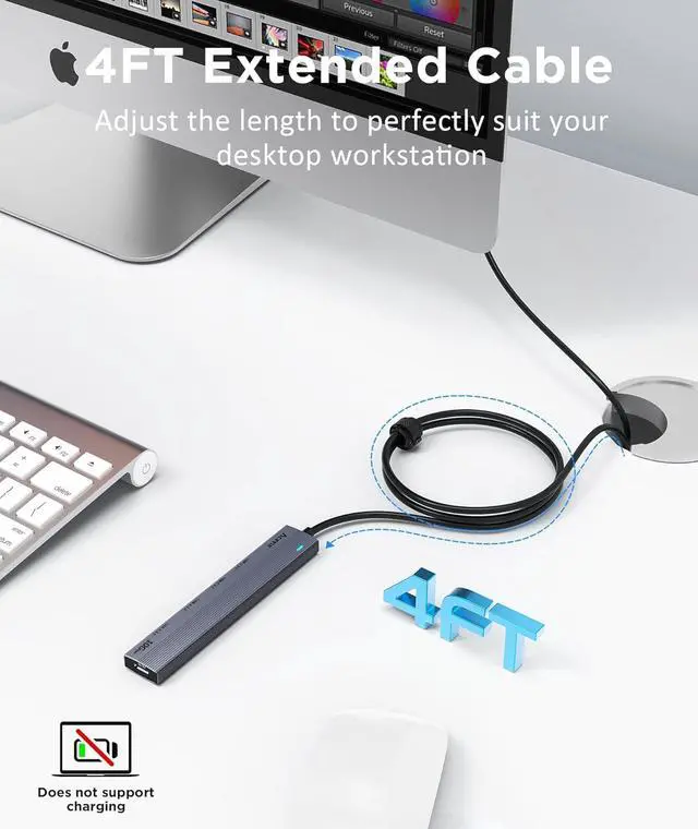 4ft Long Cable + Velcro Closure4ft long cable hub is convenient for you to extend the USB port from the computer under desk or all in 1 PC. Use Velcro closures to organize excess cables.