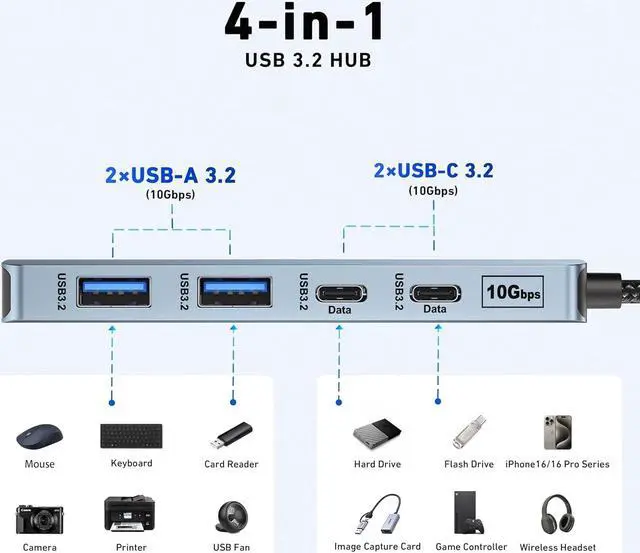 Data Transfer: The 4 Ports USB C 3.2 hub supports up to 10Gbps data transfer speed. That's fast enough to transfer a 20 GB file in just 16.4 seconds, greatly saving your waiting time