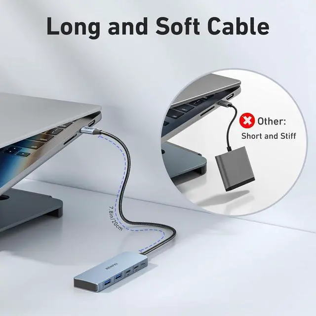Design centered on comfort and reliability: Thanks to BENFEI's end-to-end in-house cable production capability, in-house PCBA and assembly capability, using the industry's most advanced silicone woven design and process, 20cm cable in length, no knots, super-soft, the HUB is easy to use in all scenarios: laptop, tablet, stand etc. Super-soft, 25000+ life cycles, to meet your daily carrying and office needs.