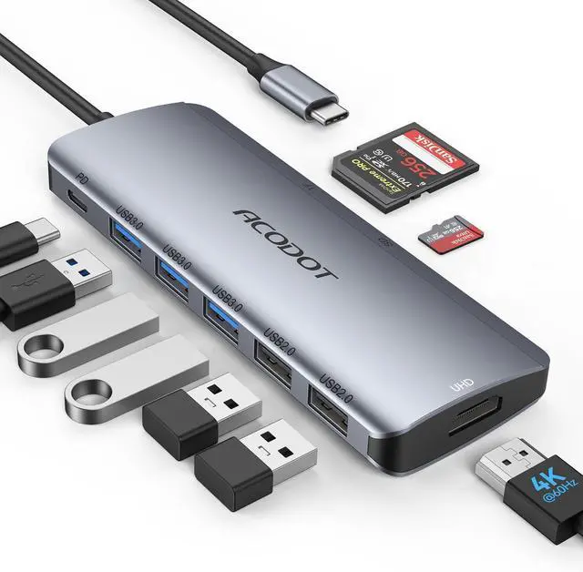 [-- - ] Acodot Usb C Hub multiport adapter expands a single USB-C port to 9 ports (1 * HDMI 4K@60HZ, 3 * USB 3.0, 2 * USB 2.0, 1 * PD charging, 1 * TF card slot, 1 * SD card slot). Plug and play, no software, drivers or complicated installation required.