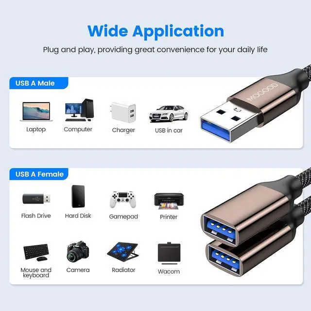 USB Splitter 1 in 2 OutWith MOGOOD USB 3.0 Splitter Y Cable you can transform one USB 3.0 ports into two USB 3.0 ports. Offers data transfer speeds of up to 5Gbps and also supports up to 2 Amps of power output.