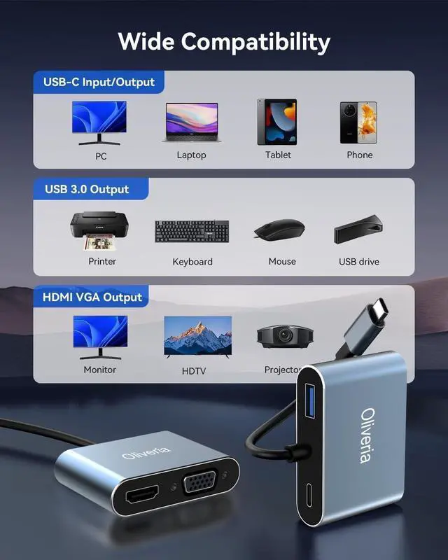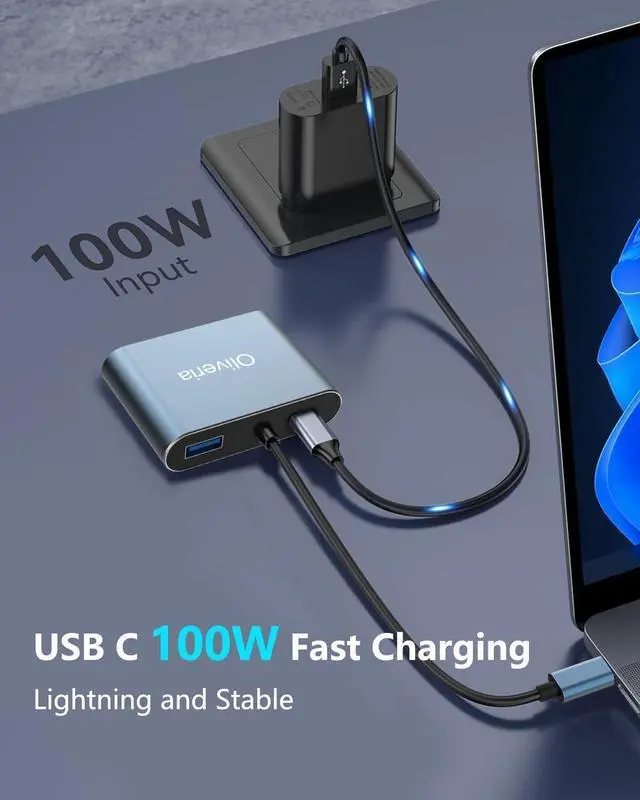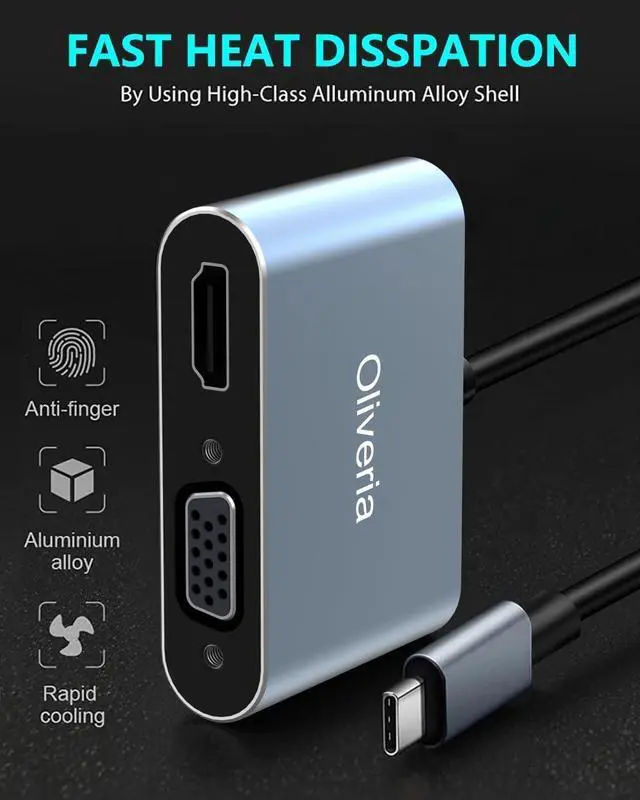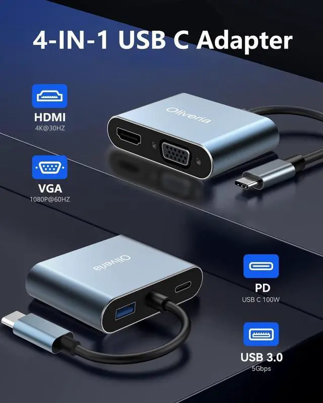 USB-C Hub: Oliveria 4-in-1 USB-C adapter extends a single USB-C port to a multiport adapter with a 4K HDMI port1, a VGA port1, a USB 3.0 port1 and a USB-C Power Delivery charging port1. It perfectly solves the problem of a single USB-C port on your laptop. All hub ports can be used simultaneously.