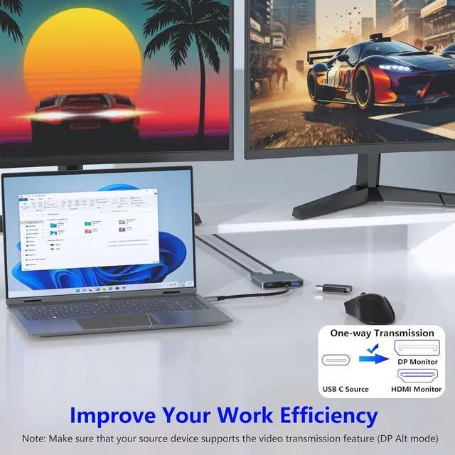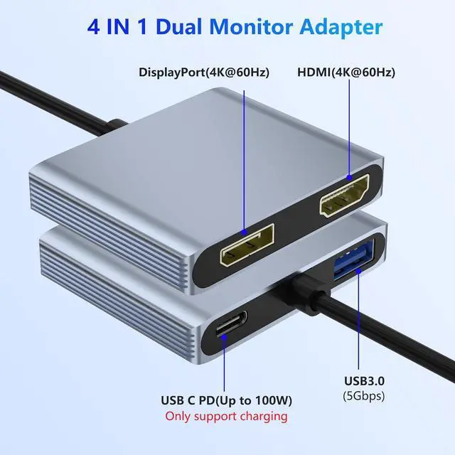 Dual Monitor USB-C Adapter for LaptopsTransform your USB-C/Thunderbolt 3 laptop into a powerful dual-screen workstation with this 4-in-1 USB-C hub (HDMI + DisplayPort + 100W PD + USB 3.0 ). Boost productivity with extended mode (Windows) or mirroring (macOS) ideal for coding, design, and multitasking.