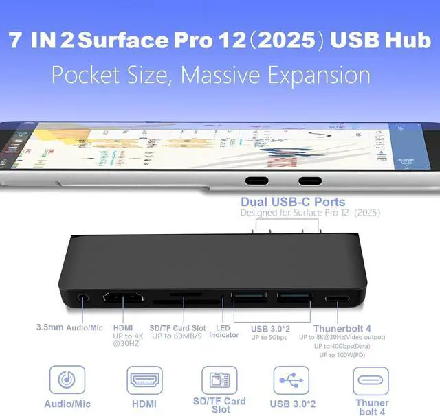 Surface Pro 12: Unlock the full potential of your Microsoft Surface Pro 12 inch! This premium Surface Pro 12 docking station is expertly engineered to transform your 2 USB-C ports into a powerful 7-port workstation. Its the ultimate Surface Pro 12 accessories, featuring a 4K HDMI, a Thunderbolt 4 USB-C port (Display+Data+100W PD), 2x USB 3.0 ports, SD/TF card slots, and a 3.5 mm audio jack. Everything you need, in one sleek, space-saving hub.