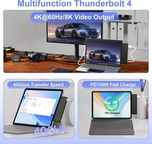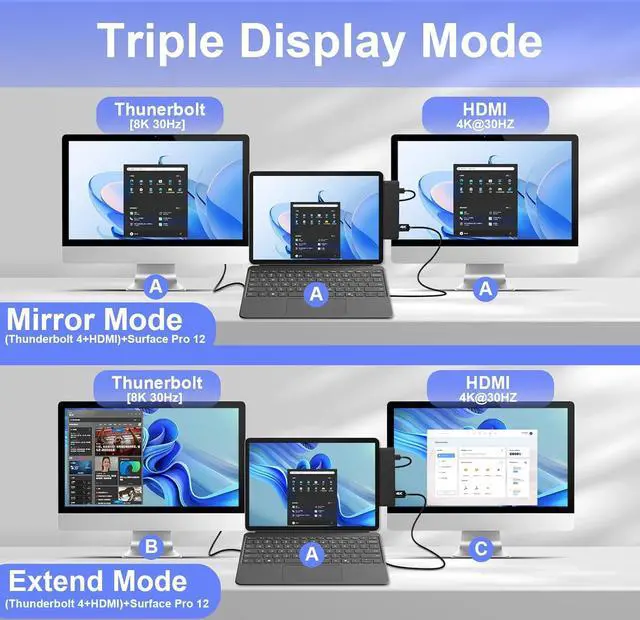 Triple Display Mode for Unmatched Productivity: This Surface Pro 12 adapter supports a stunning triple-display setup (4K HDMI + 8K Thunderbolt 4 + your Surface Pro 12 screen). Mirror or extend your displays to manage multiple applications effortlesslyideal for stock traders, programmers, designers, and anyone who needs to multitask like a pro. Output to 4K@30Hz via HDMI or breathtaking 8K@30Hz via the Thunderbolt 4 port.