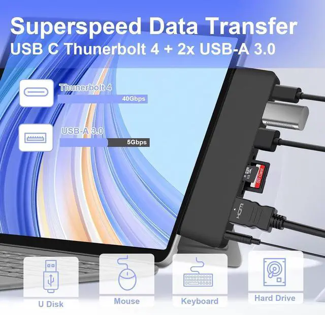 Blazing-Fast 40Gbps Data Transfer & 100W Charging: Experience unparalleled speed! The Surface Pro 12 USB C hubs Thunderbolt 4 port delivers lightning-fast data transfer at 40Gbpsperfect for moving large files in seconds. Simultaneously, it provides 100W PD pass-through charging to power your device and keep it at 100%. The dual USB 3.0 ports offer 5Gbps speeds, and the dedicated SD/TF card readers make photo and video editing a breeze for creators.
