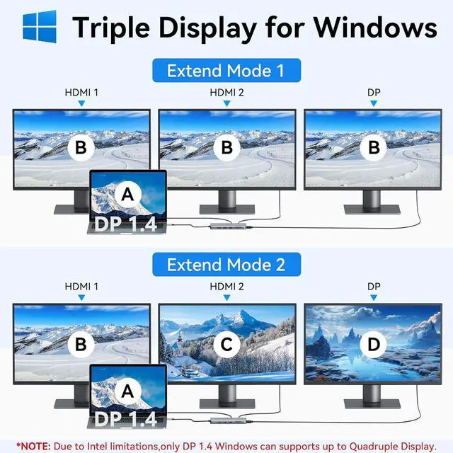 Monitors: This docking station for laptop dual monitor ONLY Windows system support MST and SST(Mirror & Extend Mode). Single use HDMI1 or DP can up to 4K under DP 1.4 source. The resolution of monitors will be always consistent with laptop if mirror display under
