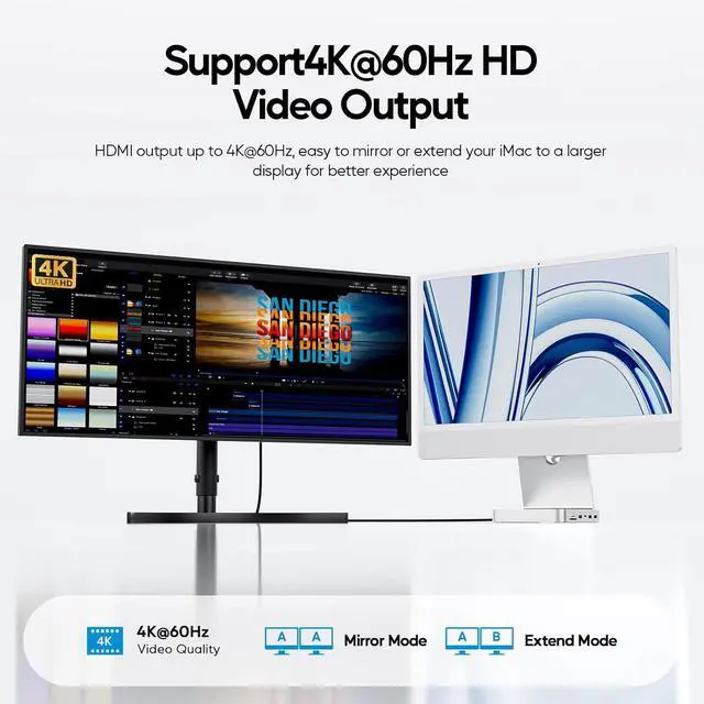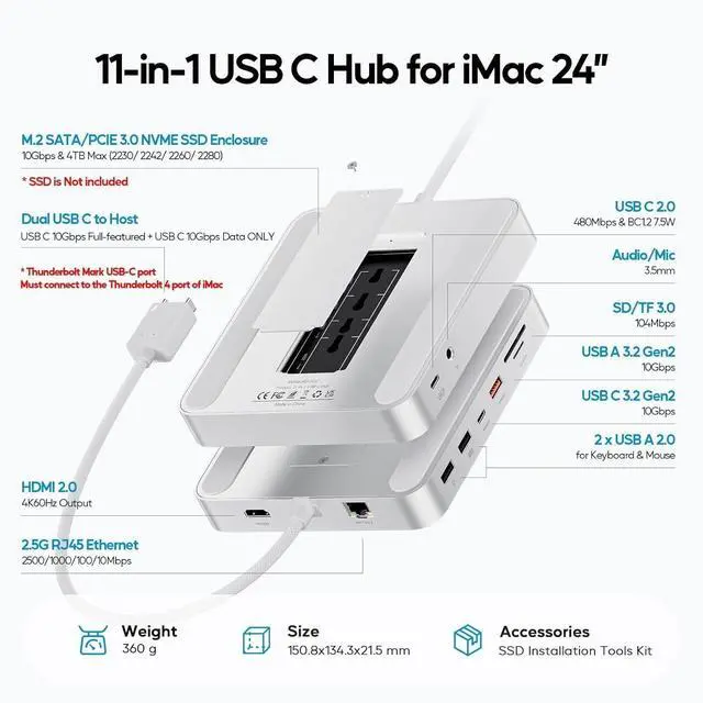 11-IN-1 USB C HUB DESIGNED FOR IMAC 24 INCH - Custom-designed for iMac 24 inch 2021/2023/2024, both an iMac dock stand and an iMac hub docking station. As a functional imac 24 inch accessories, this imac hub features a 4K 60Hz HDMI, M. 2 SSD enclosure, 2.5G ethernet, USB C 3.2 Gen2 10Gbps, USB A 3.2 Gen2 10Gbps, USB C 2.0 with BC 1.2 7.5W charging, 2 x USB A 2.0, SD/TF card reader, 3.5 mm audio/mic jack, providing comprehensive connectivity and powerful productivity for your iMac