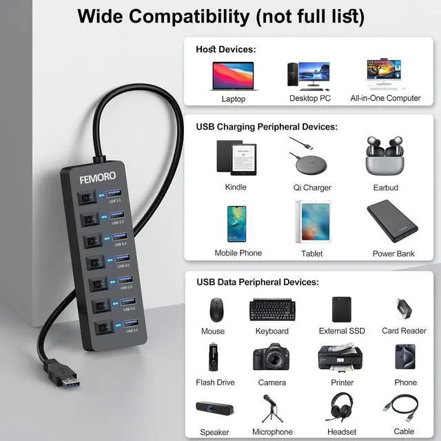 Broad Compatibility: The usb port extender to 7 external USB 3.0 data ports, support for keyboard, mouse, printer, hard drivers, usb flash drive, usb fan and more usb devices.