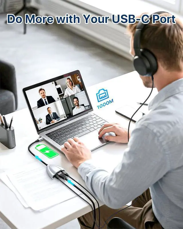 All-in-One Ethernet AdapterThe USB-C network adapter combines multiple essential features into one compact device. It offers a 1Gps Ethernet port for wired internet, a USB C 2.0 for 60W charging and transfer large files, and a 3.5 mm headphone jack for audio connectivityperfect for on-the-go work, live broadcast, gaming