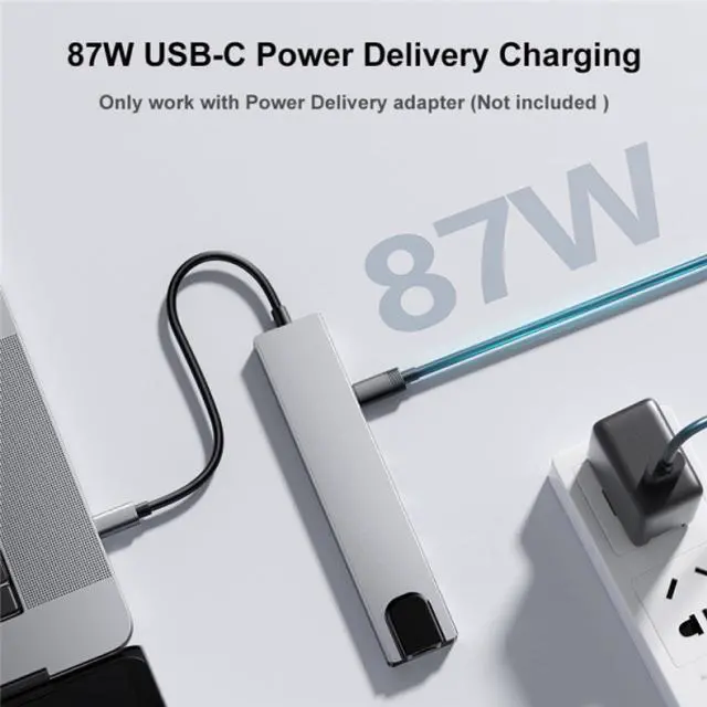 Efficiently USB C Hub to RJ45 EthernetUSB C hub multiport adapter supports a 100W USB C pass-through charging, ideal for MacBook Pro/Air and other USB C devices. RJ45 Ethernet ensures a more stable and faster wired network connection.