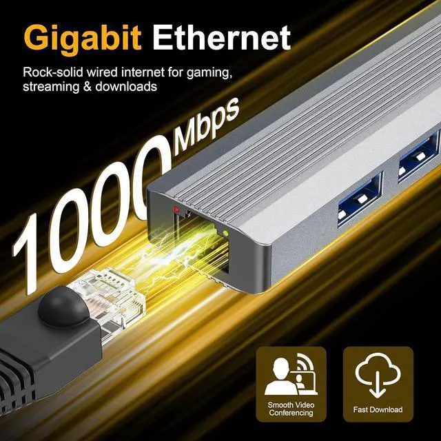 Gigabit Ethernet for Wired Stability & SpeedEquipped with a 10/100/1000 Mbps RJ45 LAN port, this USB C hub provides a rock-solid and reliable internet connection. Ideal for lag-free online gaming, uninterrupted video conferences, and for handling fast, stable large file downloads.