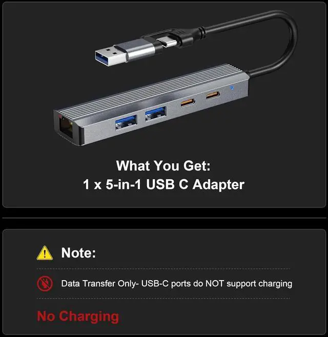 Expands Your Connectivity Effortlessly Solves the limited port problem on modern thin laptops. Instantly add a wired network connection, two standard USB ports, and two USB-C data ports. This hub is compatible with MacBook, Chromebook, and other Windows laptops. The compact design is perfect for home, office, or travel.