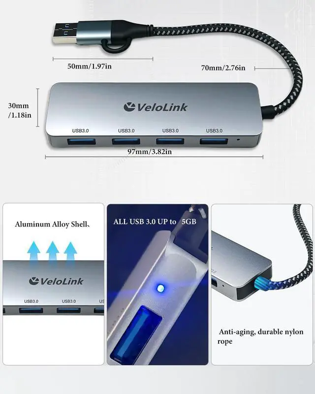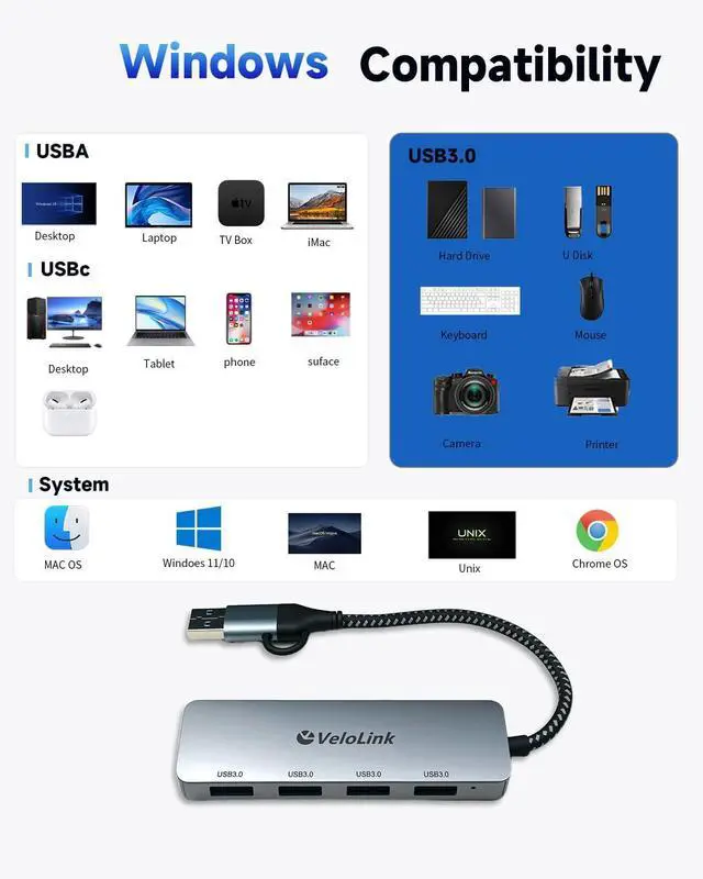 USB 3.0 Hub, Ultra-Slim Data USB Hub with USB3.0 * 4, for MacBook, Mac Pro, Mac mini, iMac, Surface Pro, XPS, PC, Flash Drive, Mobile HDD (USB A +C to USB A 3.0 * 4)